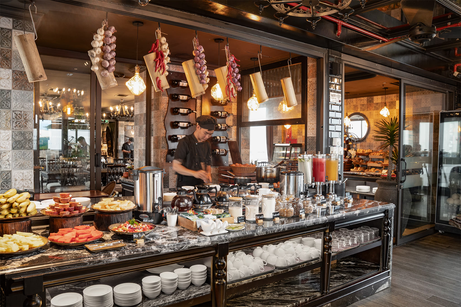 Start your day with our diverse breakfast buffet, offering global cuisines, including vegetarian, vegan, and gluten-free options